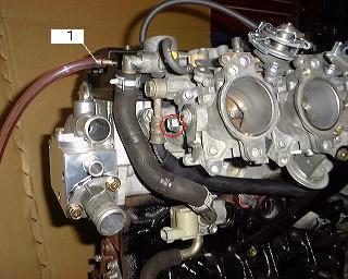 O赤丸部の4スロ4番側のブレーキ配管は短い10mmボルトで塞ぎます ◆ISCVをシリンダーに移設して延長したFUELホースを取り付けます ◆1ブローバイの取り出しは塞がないで下さい |